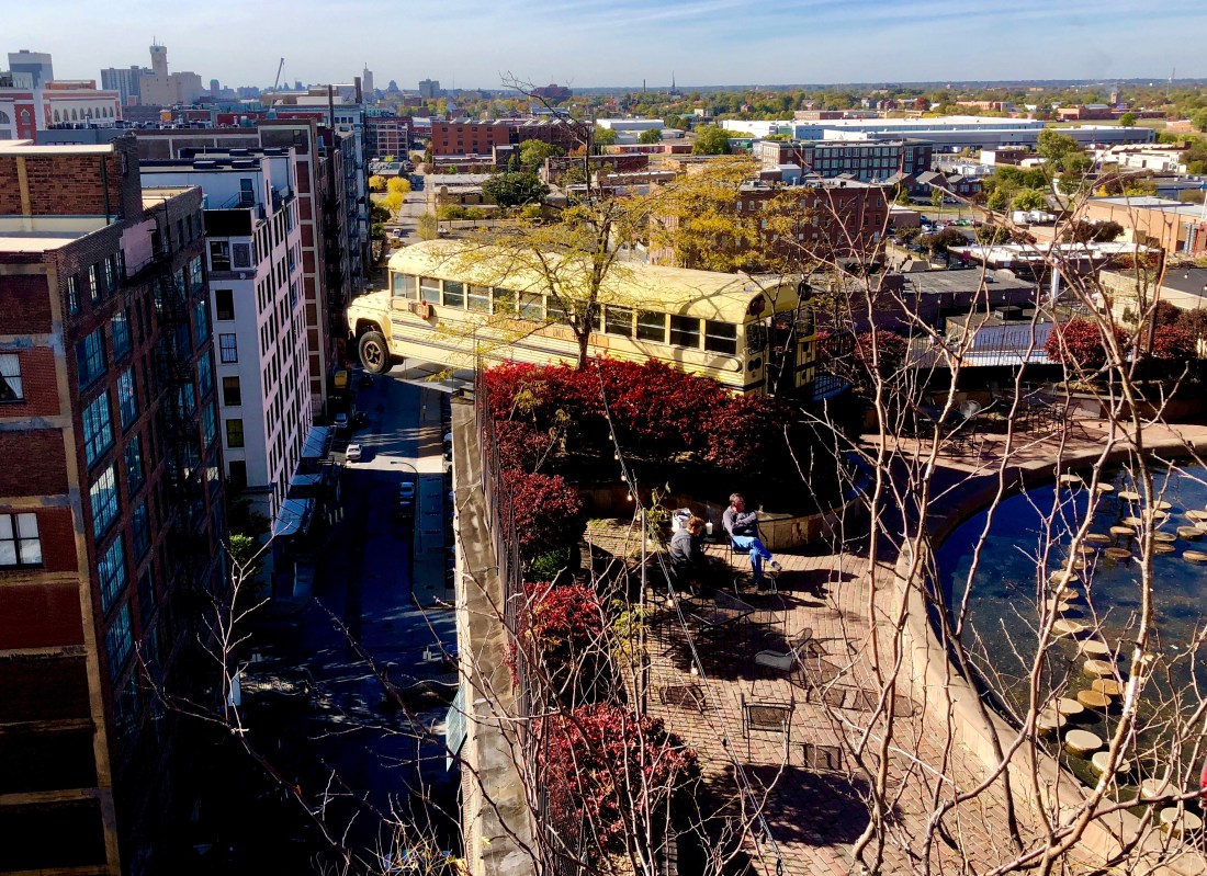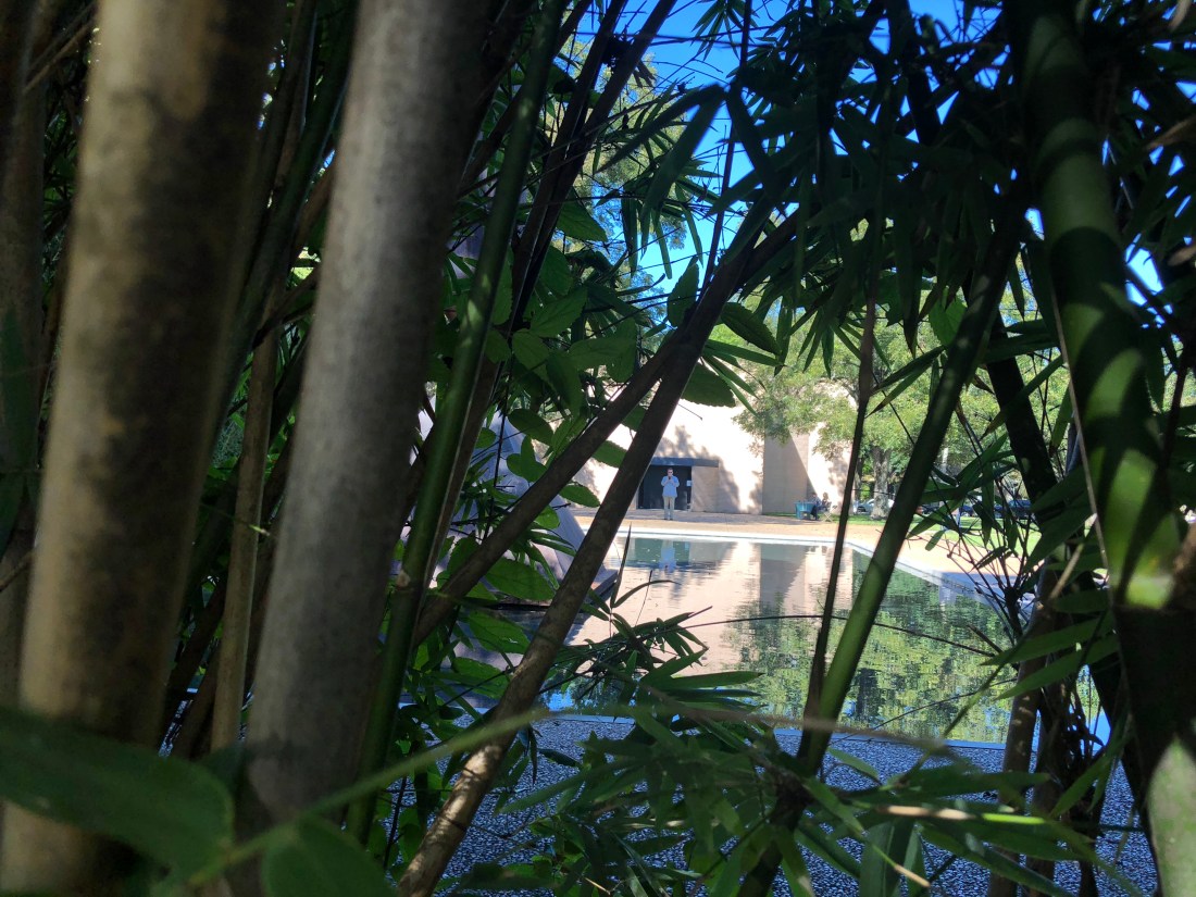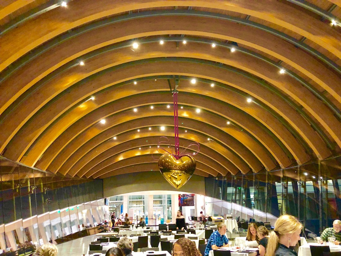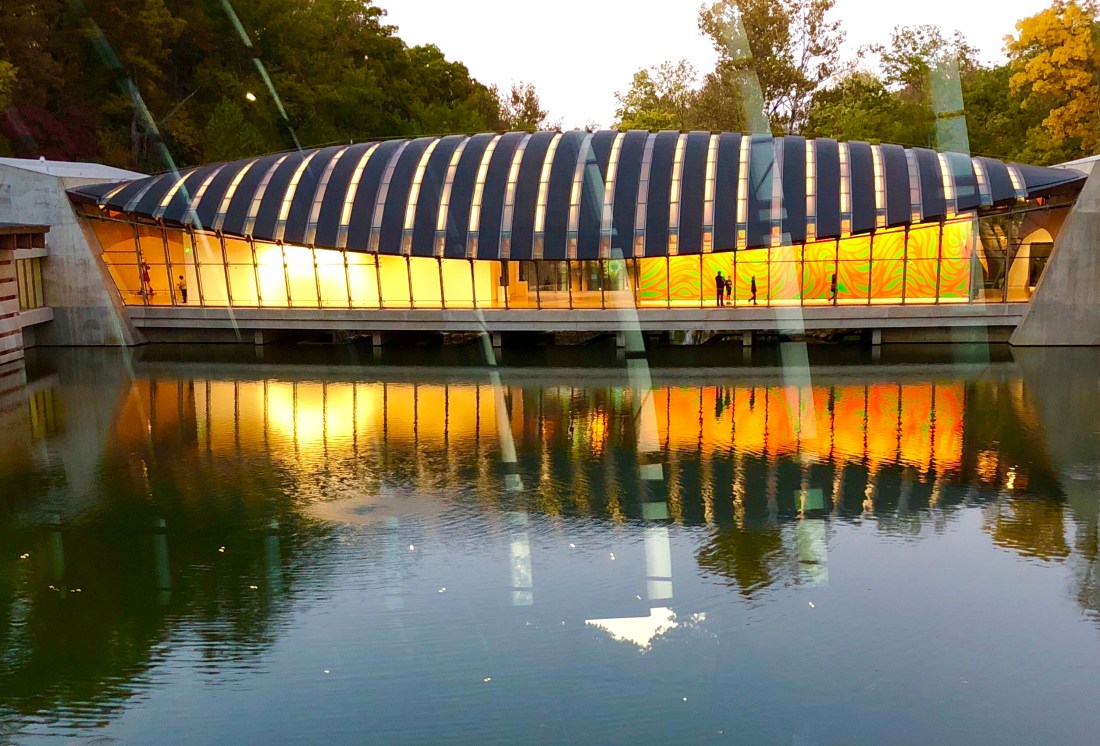 Crystal Bridges Museum belongs to the Walton family. The design echoes the shape of the hills into which it is nestled. It sits over a creek which was dammed to create a pond. The museum houses an excellent collection of American art. We saw Rosie the Riveter by Rockwell. We also toured a Usonian house by Frank Lloyd Wright and had a tasty dinner of toasted quinoa and Anasazi beans at the museum’s restaurant under a giant Jeff Koons heart. After dark we drove 77 more miles to a hotel along the road.