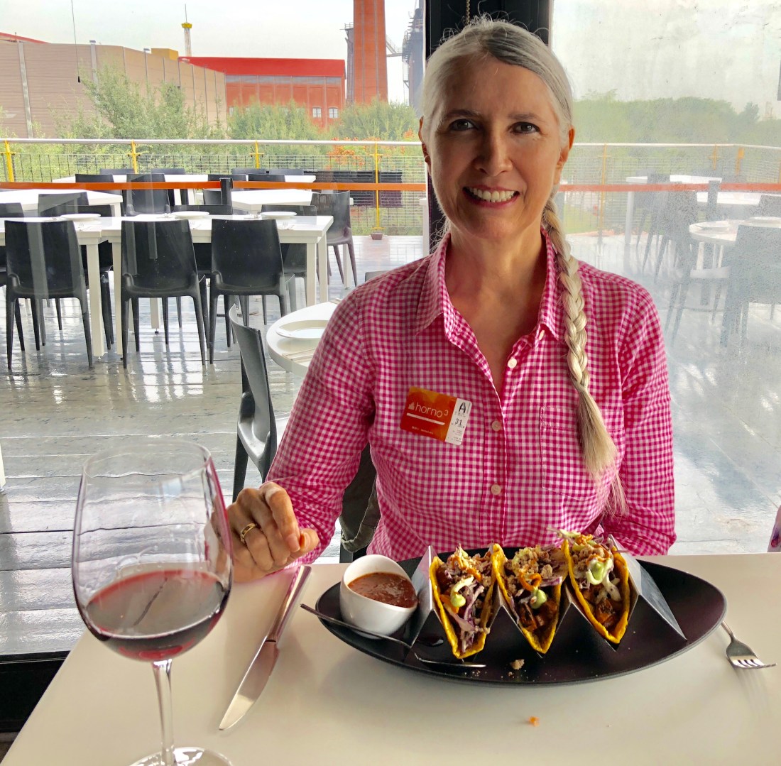Whoever invented tacos had a sense of humor…they are so messy and fun! We had the vegan version, rustic pizza, pistachio bread and a vegan brownie with local berries and coconut sorbet. Washed it all down with a glass of Mexican pinot.
