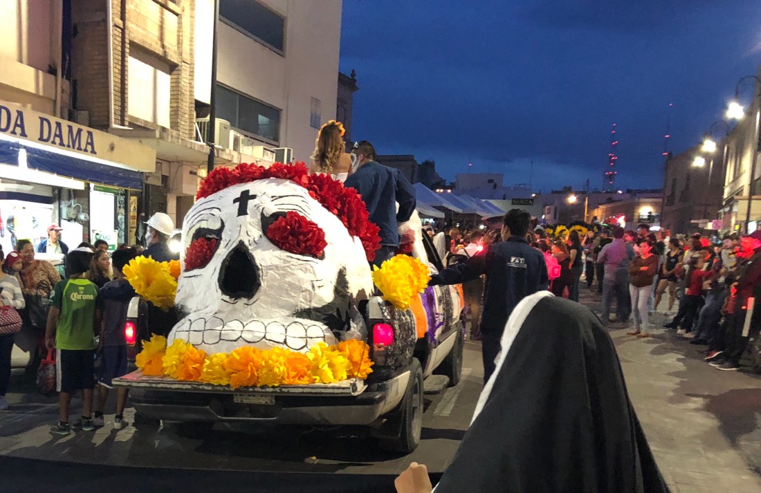 We then drove 52 miles to Saltillo, arriving just in time for the crazy, fun Day of the Dead parade. There were lots of floats, mariachi bands, Coco impersonators, gigantes (giant puppets), motorcycles and dancers.