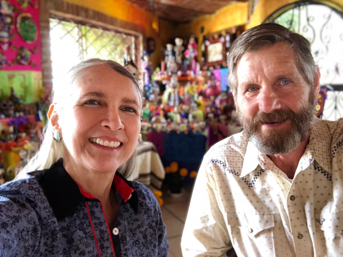 We ate lunch at Dos Jorges (carrot and squash enchiladas with tomatillo sauce, rice, beans and café de olla) where half the restaurant was taken up by grinning skulls.